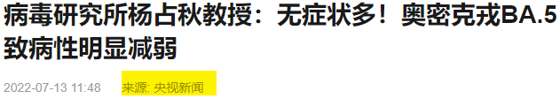 2022 年 7 月 11 日,央视采访了武汉大学医学部病毒学研究所副所长杨占秋教授,杨教授在直播里说了这样一句话:奥密克戎 BA5 并不攻击肺部。