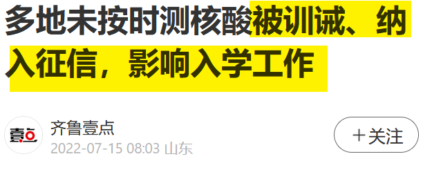 今天山东齐鲁热点发布消息,很多地方把「不按时检测核酸纳入征信,影响入学和工作,还会被训诫。」