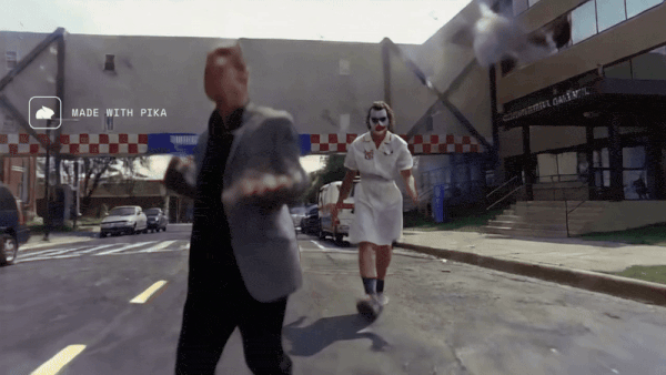 《蝙蝠侠:黑暗骑士》里的小丑炸医院,是经典中的经典,我们截取几秒的片段,然后上传一张马斯克的半身照,让他走在小丑的旁边。