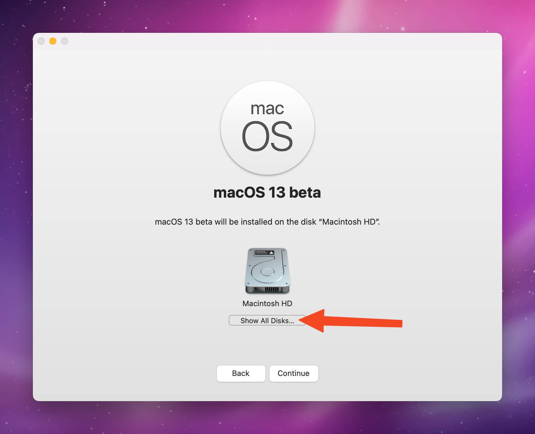 /Applications目录会多出来一个Install macOS 13 beta.app这样的 App,打开它。在选择安装硬盘界面时,点击Show All Disks…